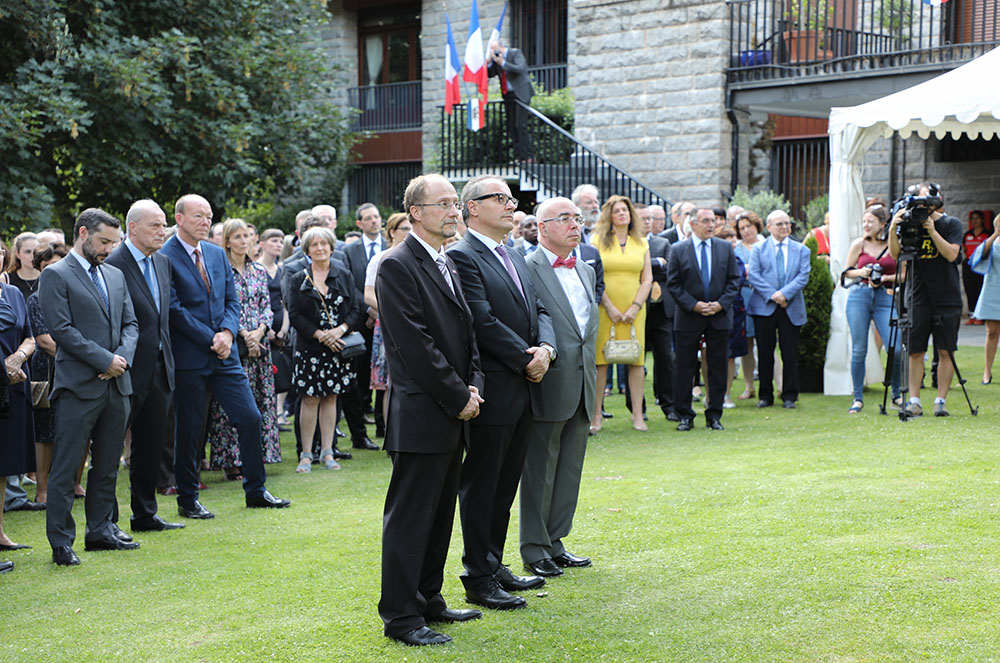 El cap de Govern, Toni Martí, no va poder assistir a l’acte i Maria Ubach, ministra d’Exteriors, va ostentar la seva representació. També hi eren presents els ministres Gilbert Saboya, Eric Jover, Eva Descarrega i Jordi Torres, els líders dels partits de l’oposició, com Pere López, Víctor Naudi, Josep Pintat i Ferran Costa. Així mateix també hi van assistir els cònsols majors de Sant Julià, Encamp i Canillo, i el cònsol menor d’Andorra la Vella. Com és habitual, la festa del “14 juillet” va aplegar una nodrida representació del sector econòmic, policial i judicial.