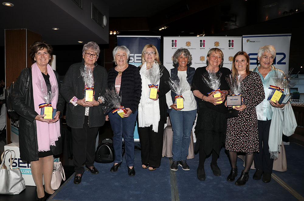 Tot seguit, les grans protagonistes de la vetllada, Roser Duró, Teresa Cairat, Angelina Mas, Maria Teresa Servat, la periodista d’aquesta casa, Mari Carmen Grau, Pilar Cobos, Rosa Ferràndiz, Meritxell Marsà, Tere Morató i Marta San Juan; van rebre una placa conmemorativa i un perfum Eau d’Andorra by Dona Secret.