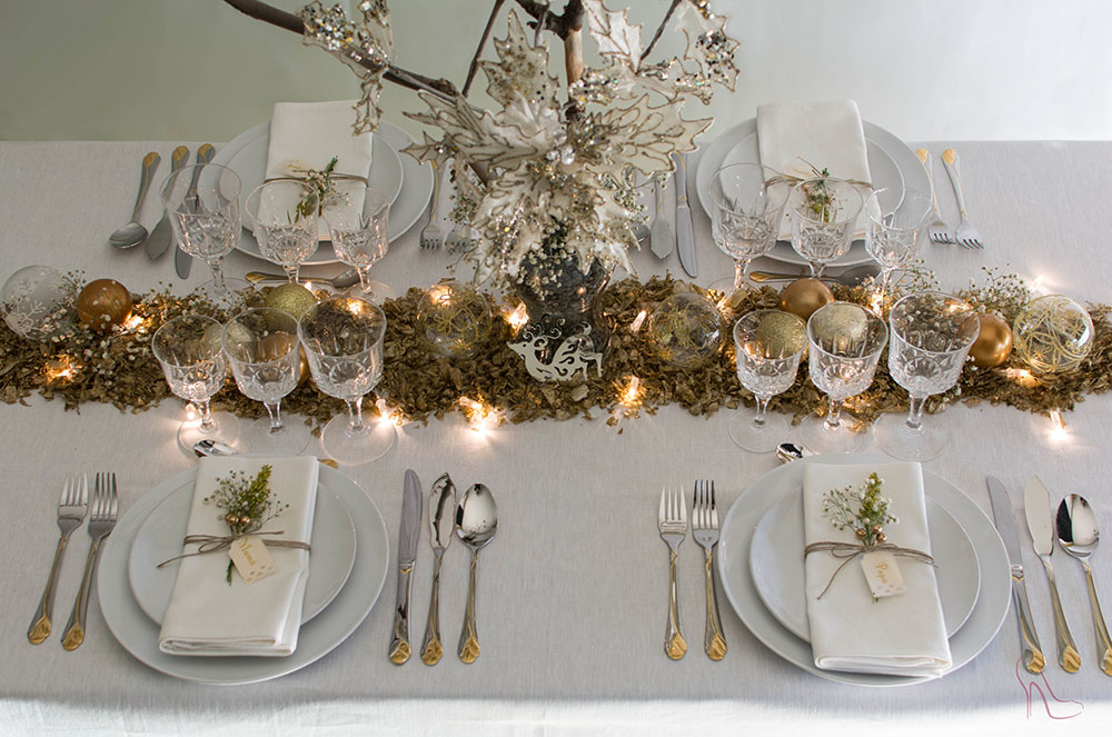 Podem buscar unes tovalles amb fils platejats o daurats, que donaran molta llum a la taula, o bé posarem tovalles blanques i camins de taula que contrastin. Una bona idea és utilitzar un plat de cortesia, més gran que l’altre; a sobre, el plat pla i un de fondo per si es menja la típica escudella. Una molt bona combinació és un plat de cortesia daurat o platejat, i a sobre, una vaixella blanca.