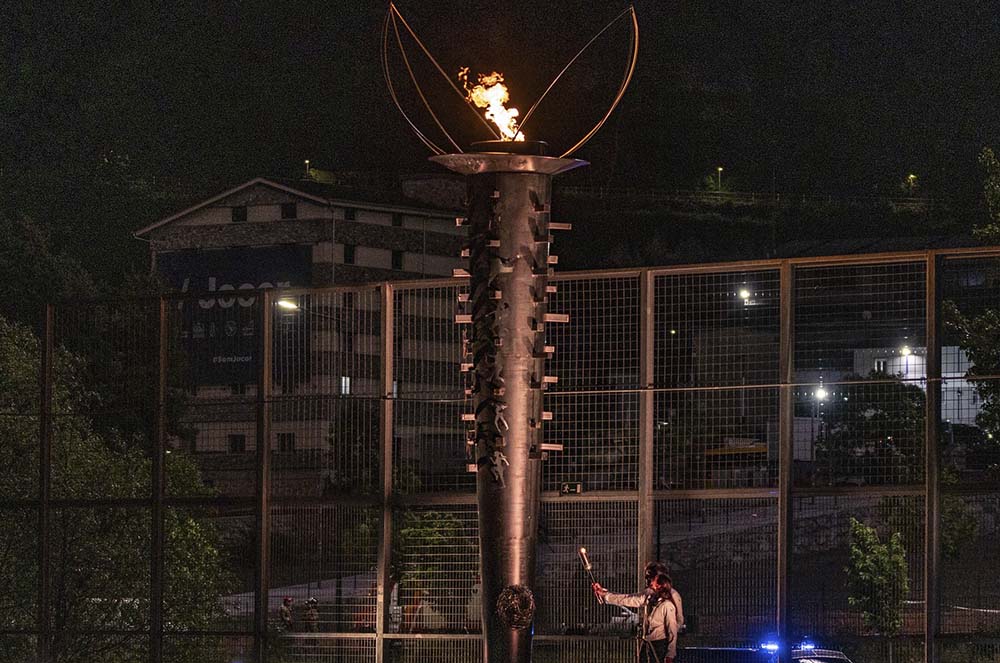 La torxa, portada per figures històriques de l’esport nacional com Emili Pérez, va culminar el seu recorregut en mans de Mònica Doria i Joan Verdú, encarregats d’encendre el peveter olímpic. L’encesa va donar pas a una pluja de focs artificials i a la cançó oficial dels Jocs, “Seguirem lluitant”.