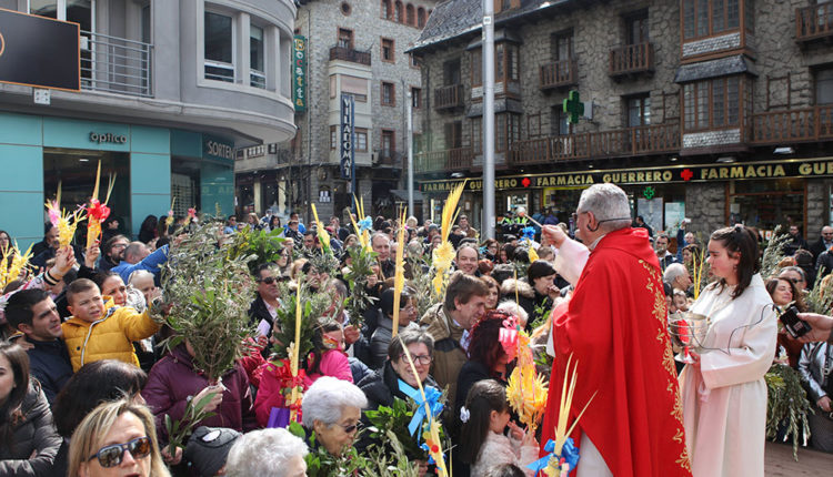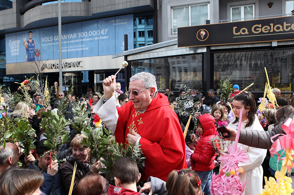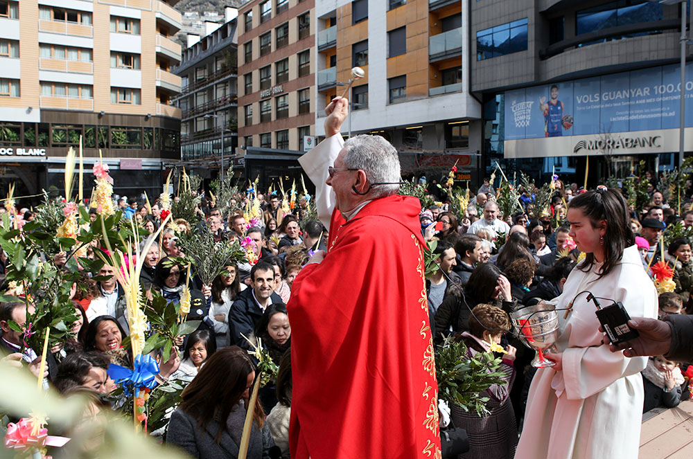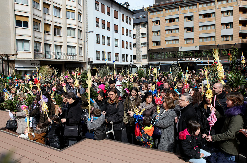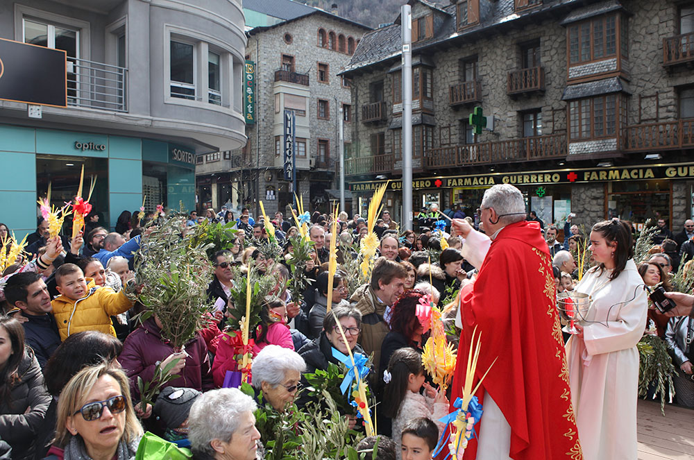 Tant el mossèn de Sant Julià, Pepe Chisvert, com el d’Escaldes, Jaume Soy, van sortir a les places Major i de l’Església, respectivament i van beneir els rams dels centenars de persones que es van aplegar a ambdues parròquies per tal de lluir i beneir les seves palmes i tot seguit es va procedir a la tradicional missa, on les dues esglésies van quedar petites per la gran quantitat de fidels que es van donar cita per aquesta celebració i moltes d’elles van haver d’esperar a l’exterior de les esglésies fins que va acabar l’homilia.