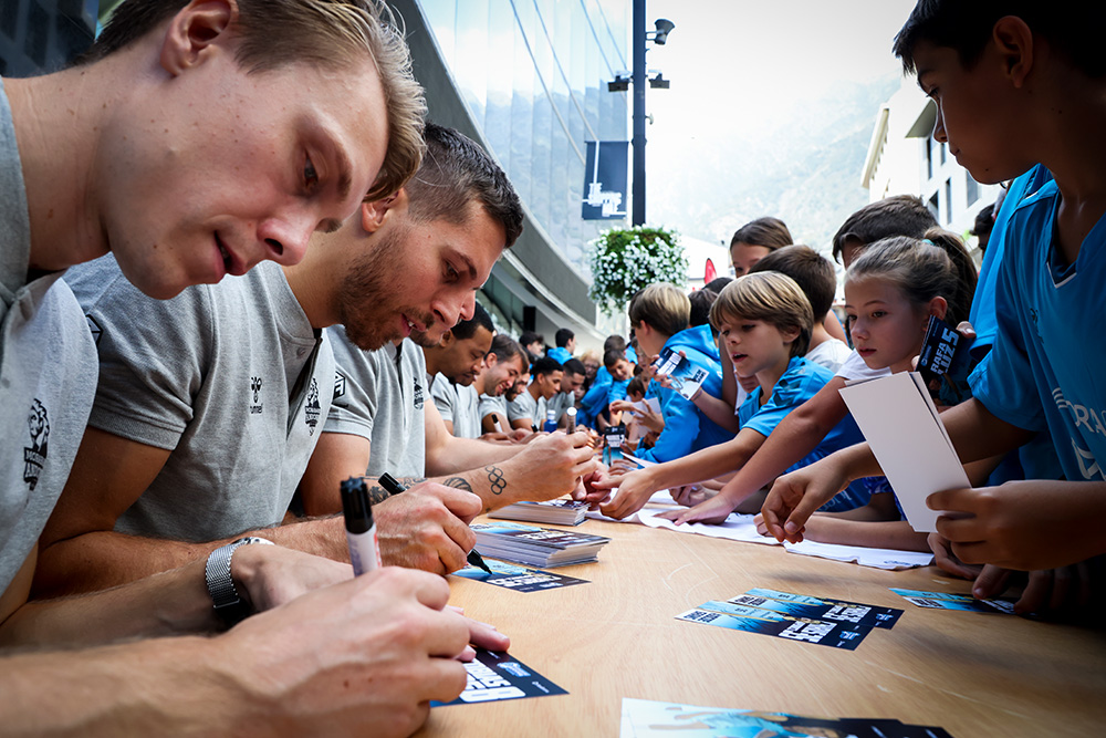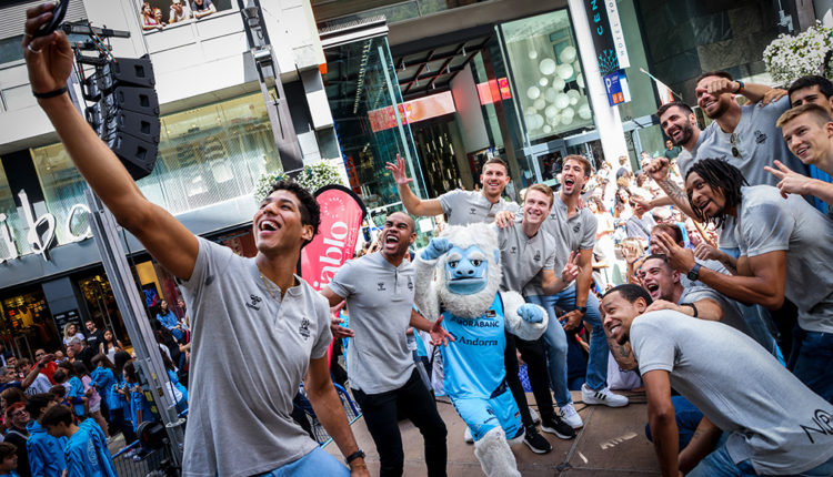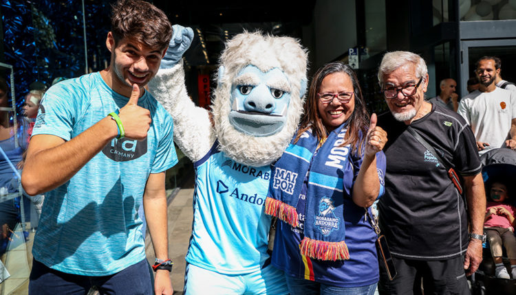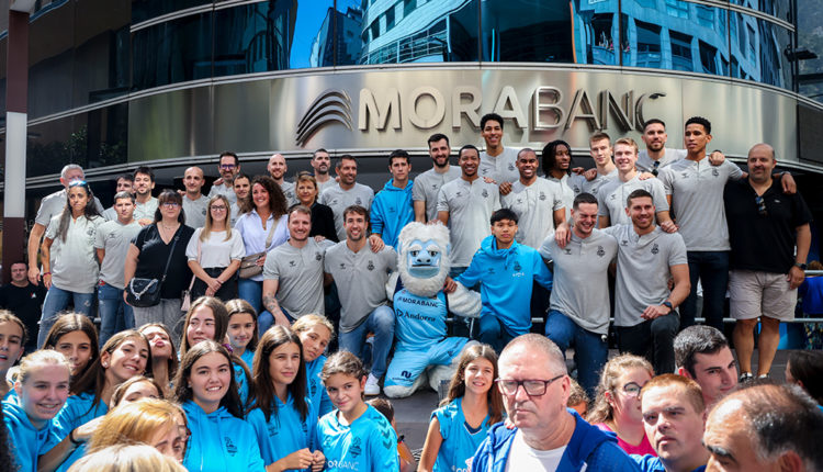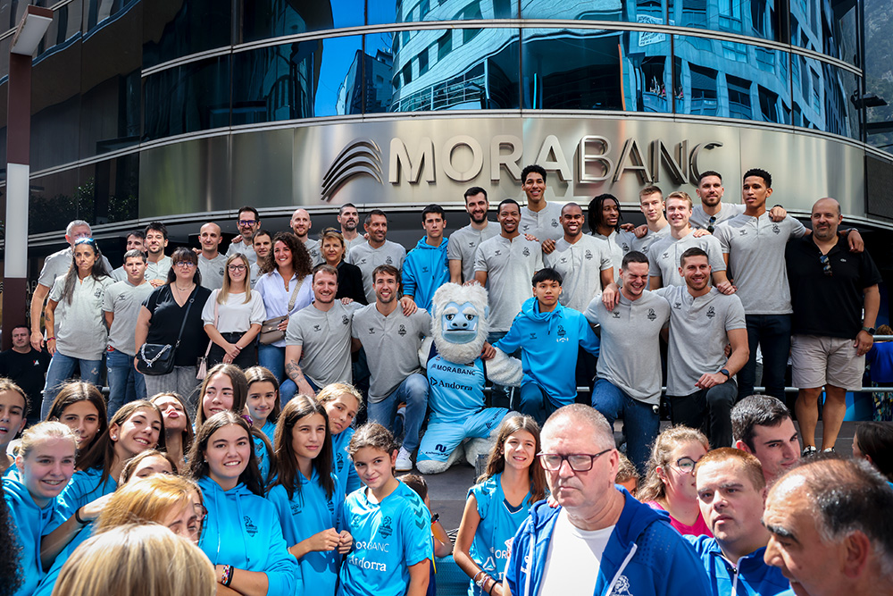 Una onada blava es va concentrar al davant de la seu administrativa de MoraBanc, a l’avinguda Meritxell, per a rebre i saludar els jugadors que defensaran l’escut del MoraBanc Andorra durant la temporada 2023-2024. No hi va faltar la música ni el ball en aquesta cita que va omplir d’il·lusió el principal eix comercial del país.