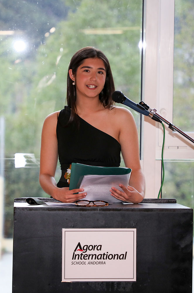 Alguns estudiants també van aprofitar per a recordar el seu pas per l’Agora International School, on van viure una de les experiències més enriquidores de la seva vida. Alguns, entre nostàlgia i alegria, com va ser el cas de la Blanca Medina Tamarit, van barrejar els somriures amb veu trencada i ulls envoltats de brillantor. “Són molts anys. Per a ser exactes, en són 16 els que porto a aquest col·legi; 16 anys que donen per molt (…), però després de tot aquest temps, intento pensar en això i no ho recordo. Només m’arriben al cap totes les rialles que vam viure a cada racó del col·legi, les converses amb els meus companys abans d’entrar a les classes, els berenars i, per descomptat, les persecucions dels professors als passadissos del col·legi”, recordava.