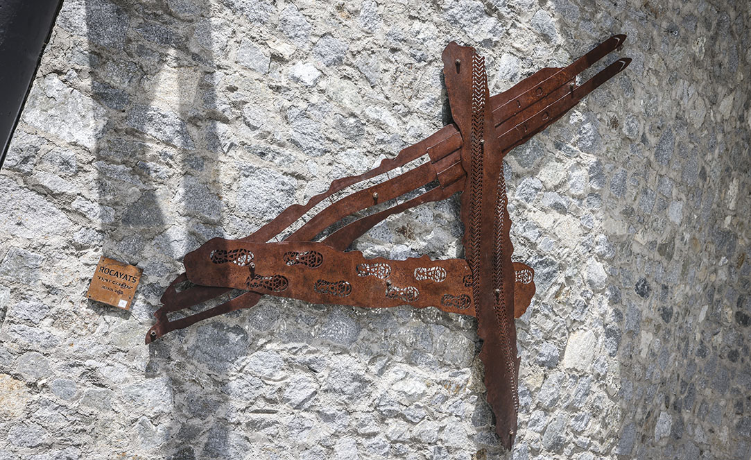 Feta en ferro corten, uns dels elements més nobles de l’arquitectura segons Roca Ayats, l’obra amb forma d’una gran ‘A’, simbolitza els tres esports que més es practiquen al país. D’una banda, el ciclisme, representat amb una petjada de bicicleta de muntanya; d’altra banda, el senderisme, amb unes petjades de persones sobre el camí, i finalment, l’esquí, l’esport nacional, amb uns esquís que destaquen sobre un dels vèrtexs superiors de l’escultura. Tot i que Roca Ayats és conscient que a Andorra es practiquen més esports que els representats, segons l’artista les tres disciplines escollides són les més conegudes per tothom.