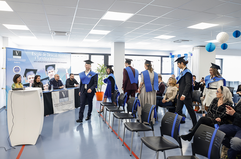 L’escola d’hoteleria i turisme d’Encamp Hotel & Tourism Business School VATEL Andorra ha celebrat aquet migdia la cerimònia de graduació dels alumnes de la quarta promoció dels estudis en Direcció Hotelera Internacional. A l’acte hi ha intervingut la Chef de Poste de l’Ambaixada de França, Amélie Mas; el conseller del Comú d’Encamp, Xavier Fernández Carrió; i Jordi Grau Lamarca, professor de cuina, xef executiu de Sport Hotels Resorts & Spa i recent guanyador d’una Estrella de la Guia Michelin al restaurant Ibaya, qui ha ofert una conferència magistral. A més, també hi ha assistit la presidenta de l’Associació Autèntics Hotels d’Andorra, Esther Santuré.