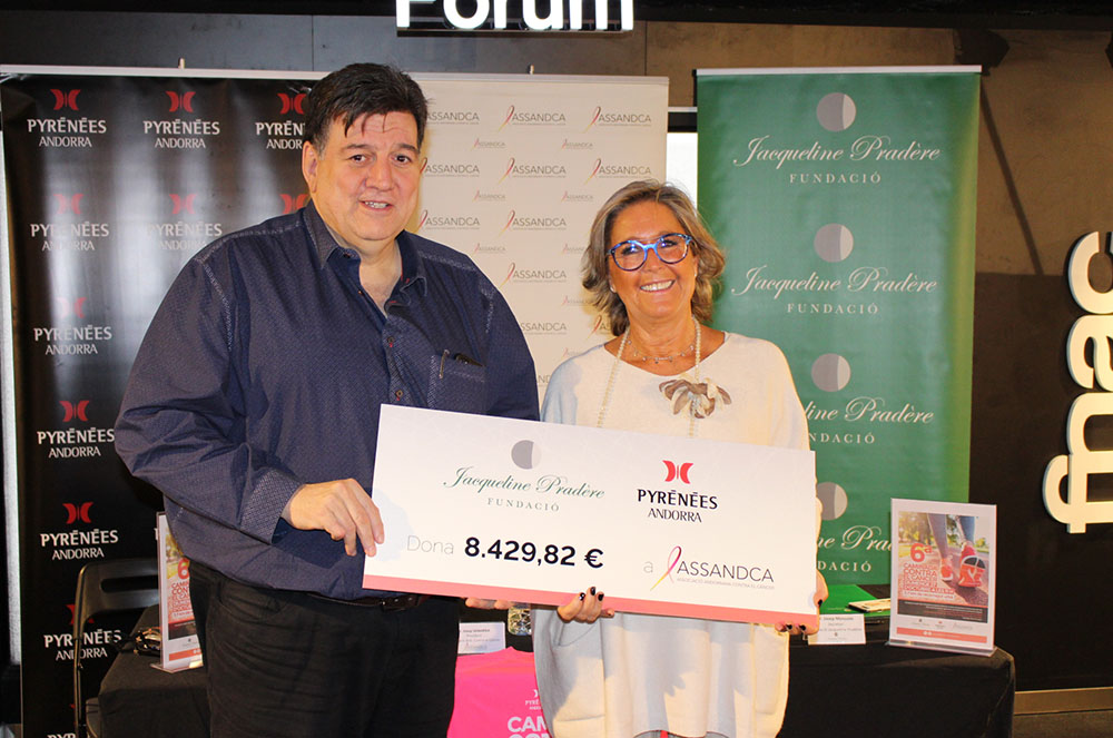 Josep Sanabria, president de l’Associació Andorrana contra el Càncer (ASSANDCA), va rebre el xec per part de Cristina Urbiola de Pérez, vicepresidenta de la Fundació Jacqueline Pradère, amb l’acompanyament de Josep Manzano, secretari de la dita fundació, i de Mirta Álvarez, responsable de màrqueting de Pyrénées Andorra.